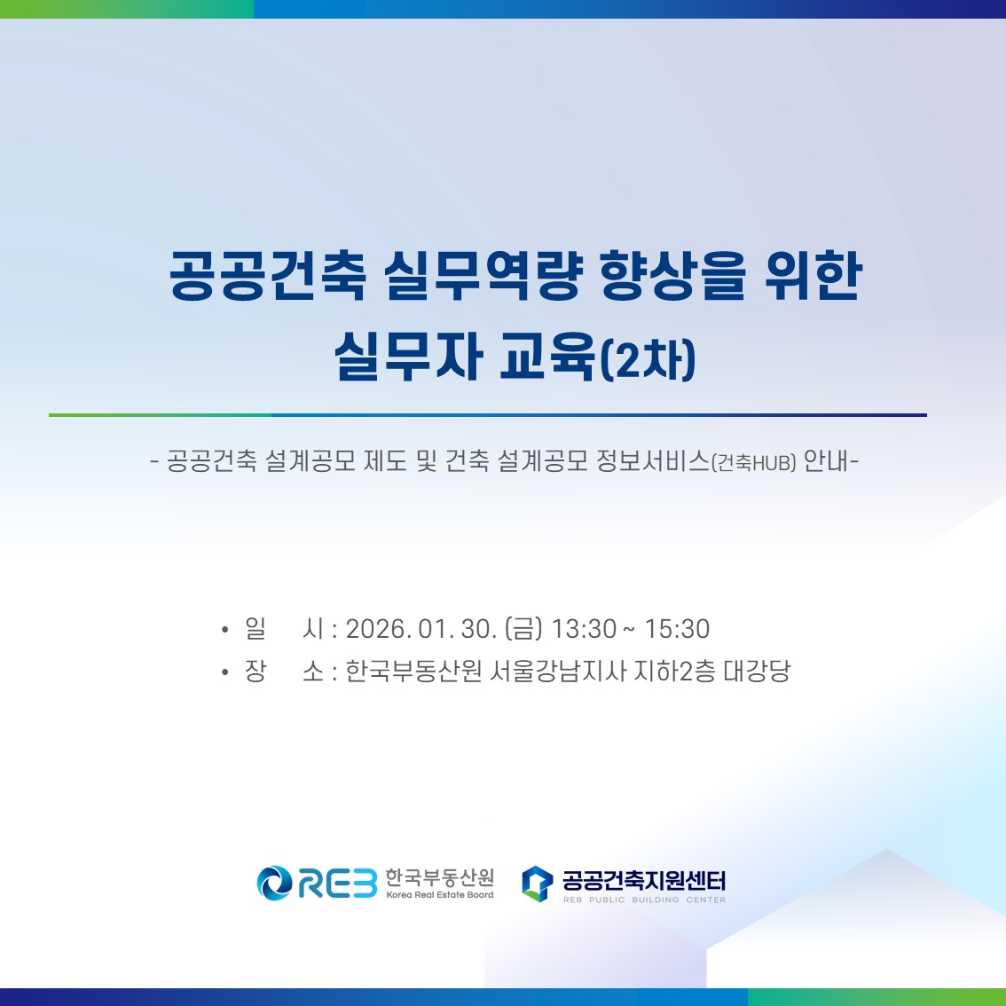 • 본 교육은 건축 설계공모 제도 이해 와 표준지침서 해설, 건축HUB 활용 안내를 통한 실무자 역량 강화 교육입니다.